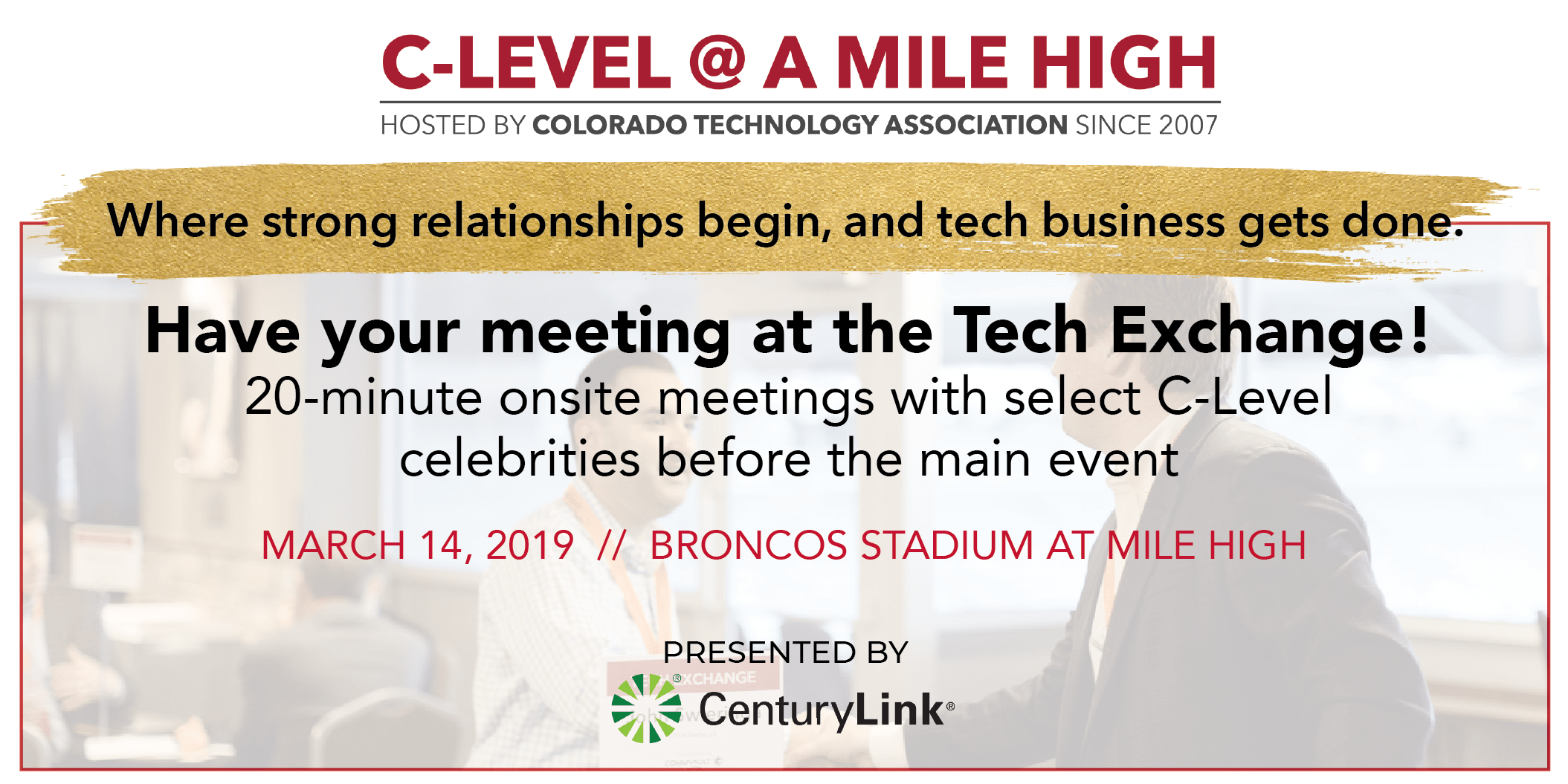 Colorado Technology Association is excited to invite you to the 2019 Tech Exchange, a unique component of C-Level @ A Mile High. The Tech Exchange provides attendees with the opportunity to buy up to three onsite meetings with select C-Level executive celebrities who have 2019 IT project spend. Attendees will have 20 minutes with up to three celebrities, before the main event, to discuss business opportunities and/or pitch. Attendees have the option to bring a senior team member and/or sales materials.
